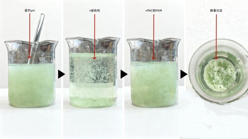 靜置沉淀,絮體聚集,出水澄清。